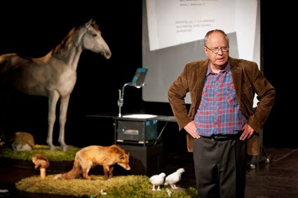 Hela Föreläsarens text finns i programbladet. När jag skummade igenom den innan föreläsningen/föreställningen blev jag först så uppgiven att jag ville gå hem. Men jag tänkte att det skulle vara värt en timme och en kvart att få se texten gestaltad på scen. Helge Skoog är onekligen en bra skådespelare med god inlevelse, men Göran Palms skrivna blankvers skapar stopp i talet och hindrar det från att bli dynamiskt. (Utom just när Föreläsaren blir arg och glömmer blankversen!) Meningarna blir bara precis tillräckligt långa för att låta som förnumstiga truismer.
