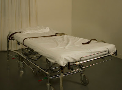 Strax intill finns ett starkt upplyst rum med vita väggar med en säng med spännbälten i mitten. Har man inte legat fastspänd i en sådan är det litet svårt att tänka sig in i användningen, men det är bra att få känna på tjockleken i bältena, och likaså att sedan gå vidare genom en lika kliniskt vit korridor med stängda dörrar.